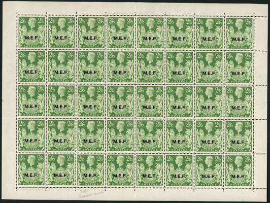 1943 2/6d yellow-green unmounted o.g. sheet of forty, two folds otherwise very fine. Three stamps in the bottom row show defective stops after ‘F’. SG M19, £320