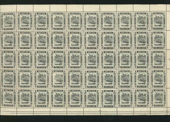 1924-37 1c black sheet of fifty unmounted o.g., which is brown, helping to show the missing ‘A’ of CA in watermark on R3/9. Also shows the R4/4 weak entry. SG 60, a, £850