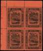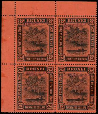 Japanese Occupation. 1944 $25 black on red paper upper left corner block of four, mint with the usual dried gum; probably unmounted but with flecks of adhesion on the gum, as often. A rare multiple, ex Steinberg. SG J19, £4400