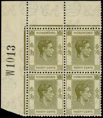 1938-45 30c yellow-olive perf 14 top left corner block of four, Requisition W and sheet 1013, unmounted o.g. Minor selvedge bend and slight offsetting on the right pair, but a very rare block. SG 151