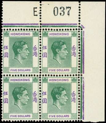 1946 $5 deep blue-green and violet top right corner block of four with Requisition E, o.g., hinged on the selvedge only. Faintly toned on the reverse, still good. SG 160, £320