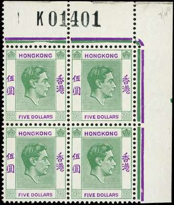 1948 $5 yellowish green and violet on chalky paper top right corner block of four with Requisition K, unmounted o.g. SC 160ab, £520