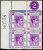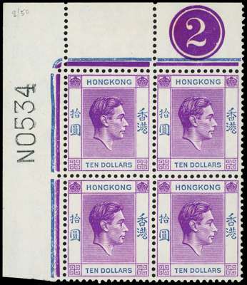 1950 $10 bright reddish purple and ultramarine top left corner block of four with Requisition N and Plate 2, unmounted o.g.; the stamps appear to be from Req. M. SG 162b, £800