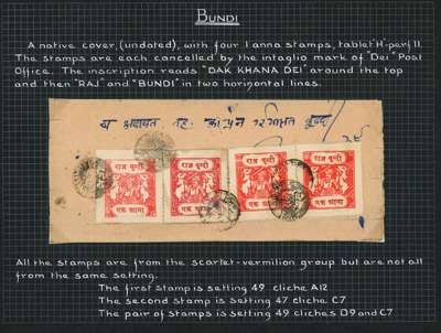 1939-41 native wrapper with four 1a scarlet-vermilion tablet Type H, perf 11, tied by intaglio seal cancels of the Dei post office. The stamps are from different settings; respectively setting 49 cliché A12, setting 47 cliché C7, and setting 49 clichés D9 and C7. Ex Alan Jobling Walker. SG 75