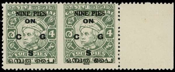 Officials. 1949 9p on 4p green with larger native characters at base, sheet margin at right, fine unused without gum. SG O104ba, £1000