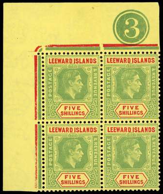 1951 5/- bright green and red on yellow paper upper left corner block of four with Plate no. 3, fine o.g., lightly hinged on the selvedge only. Some inconsequential natural gum bends, of no importance, an exceedingly rare Plate block with a handful known. SG 112c