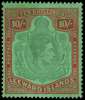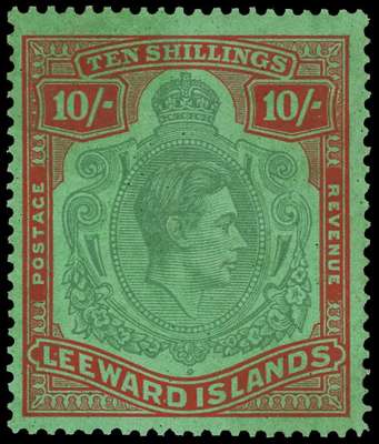 1942 (Mar.) 10/- pale green and dull red on green paper, HPF #60 broken lower right scroll, large part o.g. with some of the usual traces of toning on the gum. Very rare, ex Boakes. SG 113ae, £8000