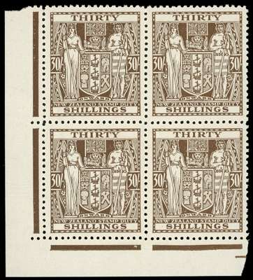 Postal Fiscals. 1940-58 30/- brown, watermark Multiple Star inverted. Unmounted o.g. corner block of four, the gum two-toned but of fine appearance. SG F205w, £2000