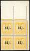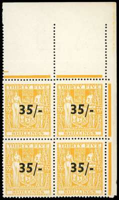 Postal Fiscals. 1939 35/- on 35/-, watermark Single NZ and Star. Top right corner block of four, unmounted o.g., crease in selvedge otherwise very fine and fresh. SG F186, £3800
