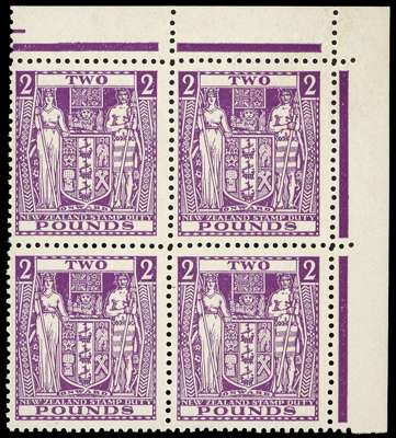 Postal Fiscals. 1940-58 £2 bright purple, watermark Multiple Star upright. Unmounted o.g. corner block of four, the gum two-toned but of fine appearance. SG F206, £900