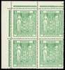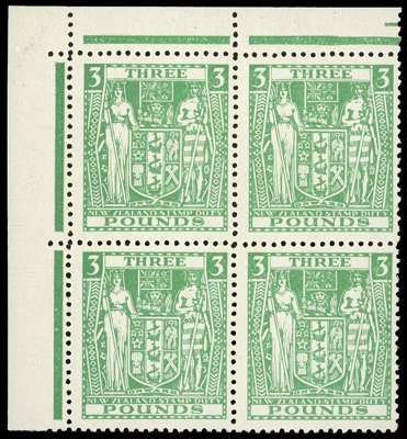 Postal Fiscals. 1940-58 £3 green, watermark Multiple Star inverted. Unmounted o.g. corner block of four, the gum unpleasantly two-toned but of fine appearance. SG F208w, £1000
