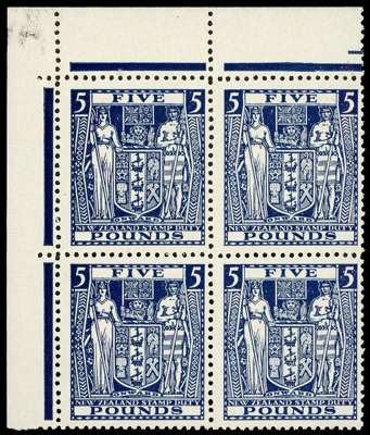 Postal Fiscals. 1940-58 £5 indigo-blue, watermark Multiple Star inverted. Unmounted o.g. corner block of four, the gum unpleasantly two-toned but of fine appearance. SG F211w, £1700