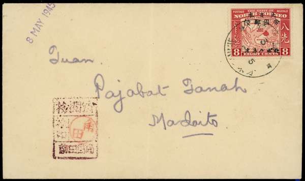 Japanese Occupation. 1945 locally addressed envelope bearing 8c with three-line overprint, tied by fine Japanese CDS of 3 May. Censor chop at lower left. Central fold, otherwise fine. Ex Cassels. SG J25