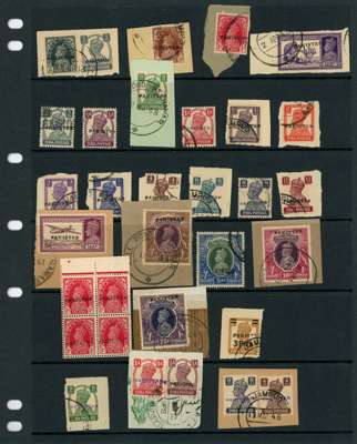 1948 handstamps on India. Peshawar metal handstamps in black on KG VI issues with 1937 3p, ½a, 1a and 2a6p; 1940 set less 1r, several on pieces including 25r, also 3p on 1a3p; in violet on 9p, 1a and the 4a+8a on piece. D&II between H310/342