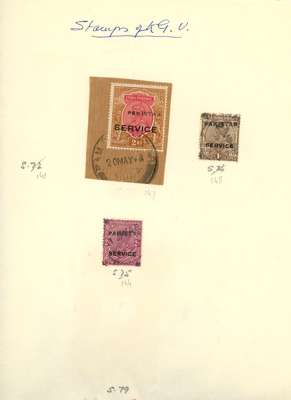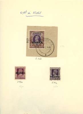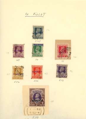 Officials: handstamps on India. 1948 Peshawar metal handstamps in black on KG V Single Star watermark 3p, 1a, 2a, 12a and 2r (on piece); Multiple Star watermark ½a, 1a, 1a3p, 2a and 4a, and KG VI 1940 set to 2a, plus 4a and 2r, also ½a purple o.g. and 1½a used inverted overprints. In violet on 1940 3p and ½a purple to 2a, plus 2r. Mounted on small pages, mainly fine. D&I between S141/188