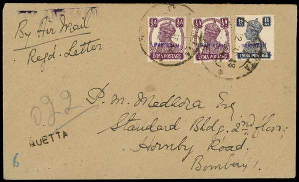 1949 handstamps on India; registered cover from Quetta to Bombay bearing ½a (2) and 8a each with violet Quetta handstamp, Quetta CDSs 12 MAR 48. D&I 107, 117