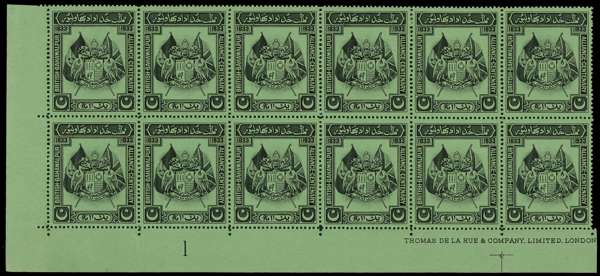 1933 Centenary 1a black on green paper imprint and Plate block of twelve, unmounted o.g. Clear gum, without the toning associated with the sheets which were stored in the Palace, a very rare multiple in this condition. CW X1