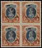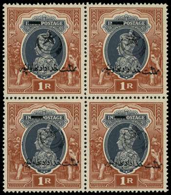 1947 ‘Star and Crescent’ 1r grey and red-brown block of four, unmounted o.g., the right pair showing the overprint slanted. SG 14, £300