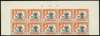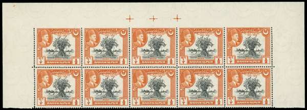 1949 Jubilee ½a black and brown-orange top two rows of sheet (ten stamps) unmounted o.g., imperforate at top, giving five pairs imperforate between stamp and top margin. SG 40 var