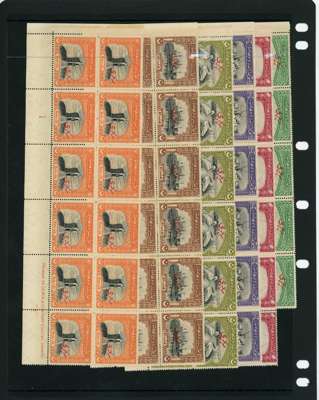 Officials. 1945 set of six in bottom marginal blocks of twelve with Plate number and imprint, save for the ½a which is in a block of ten with Plate number only (it had no imprint). A couple of values hinged on the selvedge; slight separation in places. Multiples larger than four are extremely scarce. SG O1-6, £1408