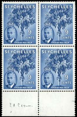 1952 9c chalky blue bottom marginal block of four, lower left stamp with St Edward's Crown in watermark, o.g. with small light hingemark. SG 160b, £375
