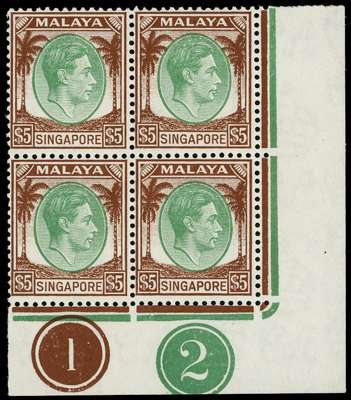 1948 $5 green and brown lower right corner block of four with Plate 1-2, unmounted o.g. SG 15, £480