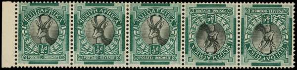 1930-44 unhyphenated ½d black and green horizontal strip of five, tête-bêche between the third and fourth stamps, fine o.g. with a small, light hinge touch between the second and third stamps. Scarce. SG 42b, £1400