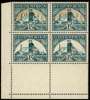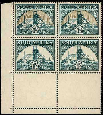 1933-48 hyphenated 1½d green and bright gold (Issue 1) with inverted watermark, lower left corner block of four with the lower pair showing the gold completely omitted, and R20/2 flag on chimney at right. O.g., the upper pair lightly hinged, the lower pair unmounted. Minor crease in selvedge at left, otherwise fine and very rare. Ex Thys Rall. SG 57dwa, £25,000
