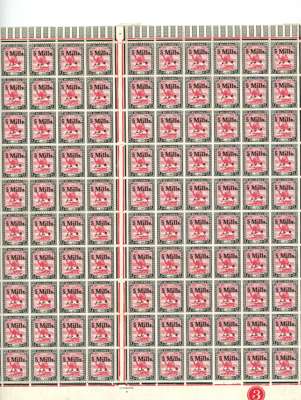 1940 5m on 10m sheet of 240 divided into two halves, o.g., reinforced by hinges in places and a little spotting on reverse. Includes varieties ‘a’ to ‘d’ two each, and the lower right pane variety inserted ‘5’, this stamp fine unmounted. SG 78, a-e, £1493