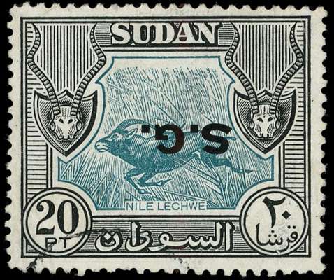 Officials. 1951 20p blue-green and black used with inverted overprint. Nibbled perf at base, otherwise fine and very rare. BPA Certificate (1997). SG O82a, £4500