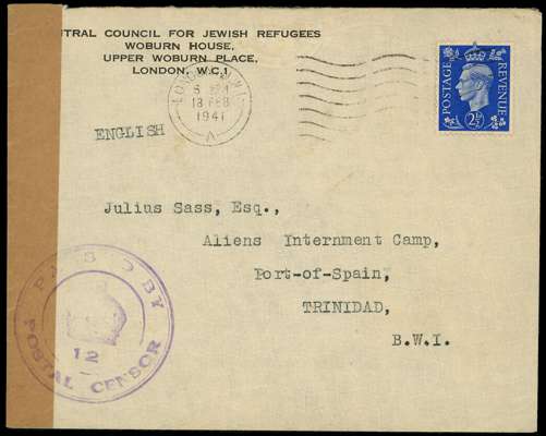 1941 incoming cover from Central Council for Jewish Refugees in London to an internee at ‘Aliens Internment Camp, Port-of-Spain’. Plain brown censor tape at left with large purple Trinidad Censor 12 on front and OPENED BY CENSOR on reverse. Ex John Daynes