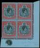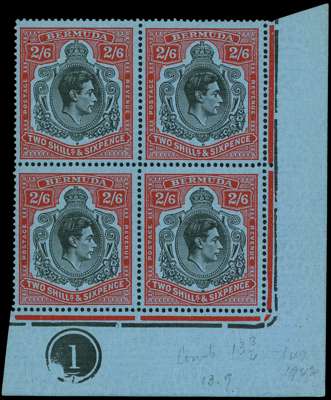 1943 (Mar) 2/6d black and red on pale blue paper bottom marginal block with Plate plug, HPF #s 59 repair to upper right scroll and 60 broken lower right scroll. Unmounted o.g. which is two-toned, fine appearance. SG 117b, be, £710
