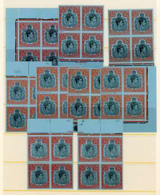 1943-8 three perf 14 blocks; four 1950 perf 13 blocks (including two Plate blocks) and two 1951 blocks. All marginal, almost all unmounted or hinged on the selvedge only; a useful group. SG 117b, c, d, £624