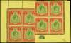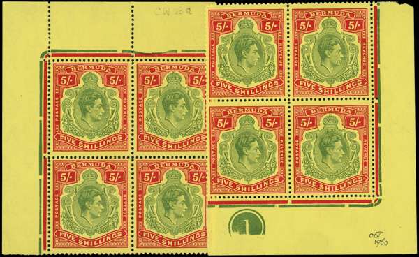 1950 (Aug) 5/- green and scarlet on yellow chalky paper, unmounted o.g. corner blocks. #s 1-14, flaws including 2a joined scrolls and 14 scratched scrolls, and the Plate block #s 47-60. Fine. SG 118g, £480