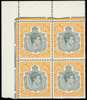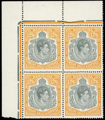 1943 (March) 12/6d pale bluish grey and orange-yellow top left corner block of four, lightly hinged on the selvedge only. HPFs #1a (trace) and 13. SG 120c, £520