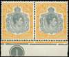 1946 (June) 12/6d grey and ‘lemon’ lower marginal pair with Plate number, the left stamp previously hinged at base with the right stamp unmounted. Hint of toning on the reverse of the selvedge, still fine and rare with Plate number. SG 120d, £1200