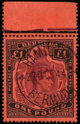 1943 £1 deep reddish purple and black on pale red paper. Top marginal example with FF #2 joined ER, fine used with Hamilton CDS 27 OCT 44. Scarce. SG 121ca, £700
