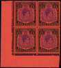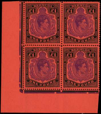 1952 (Oct.) £1 bright violet and black on scarlet paper, perf 13. Fine o.g. lower left corner block of four with HPFs including #49a cut scroll, hinged on the selvedge only. SG 121e, £720