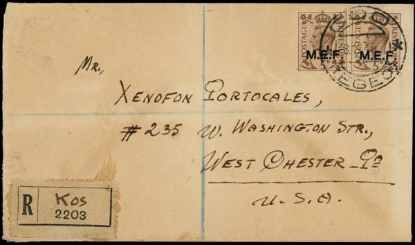 1945 registered envelope to US franked with a pair of MEF 5ds, tied by COO (EGEO) CDS of 8.12.45. Provisional registration label, various backstamps; a little gum-stained, scarce
