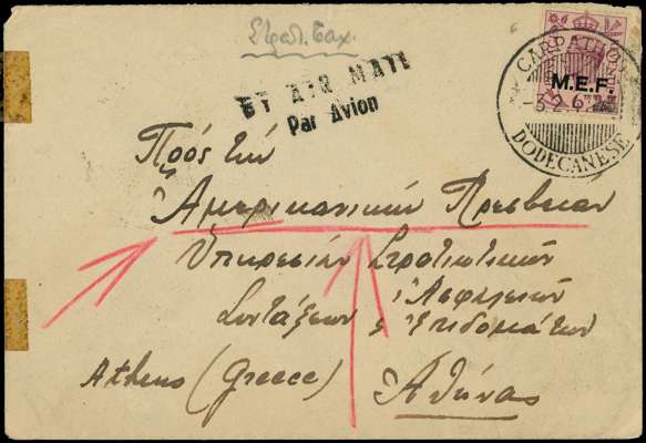 1947 envelope to Greece franked MEF 6d, Carpathos 'British issued) datestamp of 3.2.42. Rhodes transit and Athens arrival on reverse. Small sellotape remainders at left