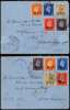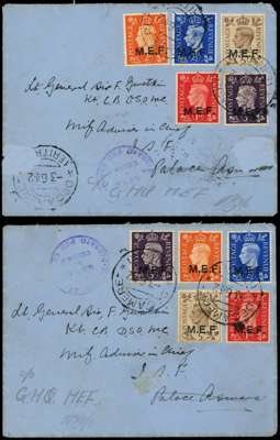 1942 envelopes (2) to General Gwatkin at Asmara, redirected to GHQ MEF. Each bears 1d - 5d dark colours, the 1d and 3d in each case having Nairobi round stops overprints. Used from Decamere 3.6.42, violet OETA. One envelope with surface damage. SG M6a, 9a