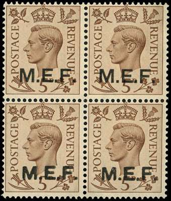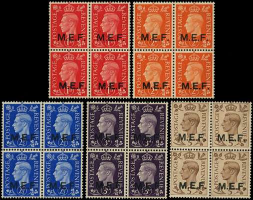 1942 Nairobi 1d - 5d round and square stops blocks of four, fine o.g., the upper pairs large part o.g. and the lower pairs unmounted. Upper pairs all with square stops save the 2½d (round stops). A rare group, Brandon Certificate (1999), SG M6b-10b, £6700