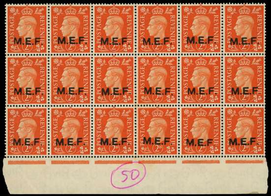 1942 Nairobi 2d round stops bottom marginal block of eighteen, unmounted o.g. Four slightly affected by foxing on the reverse, and splitting between stamps and selvedge; manuscript notation on selvedge. SG M7a, £1440
