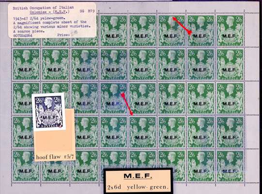 1943-7 2/6d sheet of forty, unmounted o.g., a few minor varieties; minor blemishes (wrinkles, a couple of toned spots), an interesting piece for the specialist. SG M15, £320
