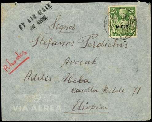 1946 envelope to Addis Ababa franked MEF 2/6d, tied by Rhodes ‘British Issued’ CDS of 2 SP. Addis Ababa arrival on reverse. Backflap missing and some toning affecting the perfs, still a scarce cover with a good destination. SG M19
