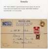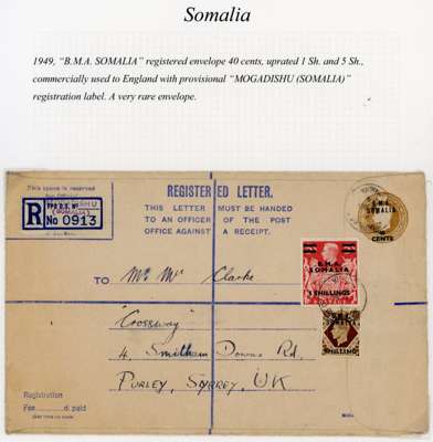 Postal Stationery. 1949 40c on 5½d bistre registered envelope, size H, uprated with BMA 1/- and 5/-. Tied by Mogadishu RLD CDSs of 31.3.49 (reverse with 1 AP strike of the same CDS). Registered label is handstamped on ‘FPO DS’ label. A rare franking on a rare commercial envelope