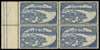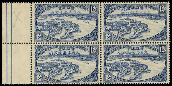 Japanese Occupation. 1942-4 12c blue marginal block of four, top right stamp with handstamp double. Normal gum browning on reverse. SG J12 var