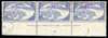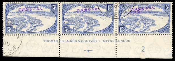 Japanese Occupation. 1942-4 15c ultramarine imprint and Plate 2 strip of three, the right stamp with handstamp double, used with Kuching CDSs of 4.9.05. Fine. BPA Certificate (2006). SG J13 var