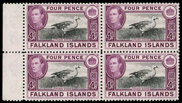 1943 printing of the 4d value in black and reddish purple, a left marginal block of four, unmounted o.g. Belfield letter of opinion (2008). Rare. SG 154 var, Heijtz 84d, £3200