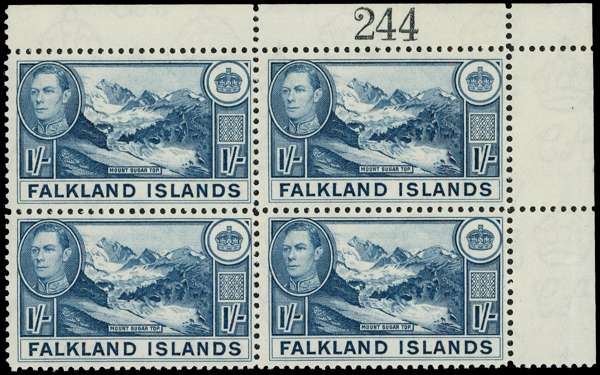 1938 1/- light dull blue top right corner block of four with sheet number, unmounted o.g. SG 158, £300